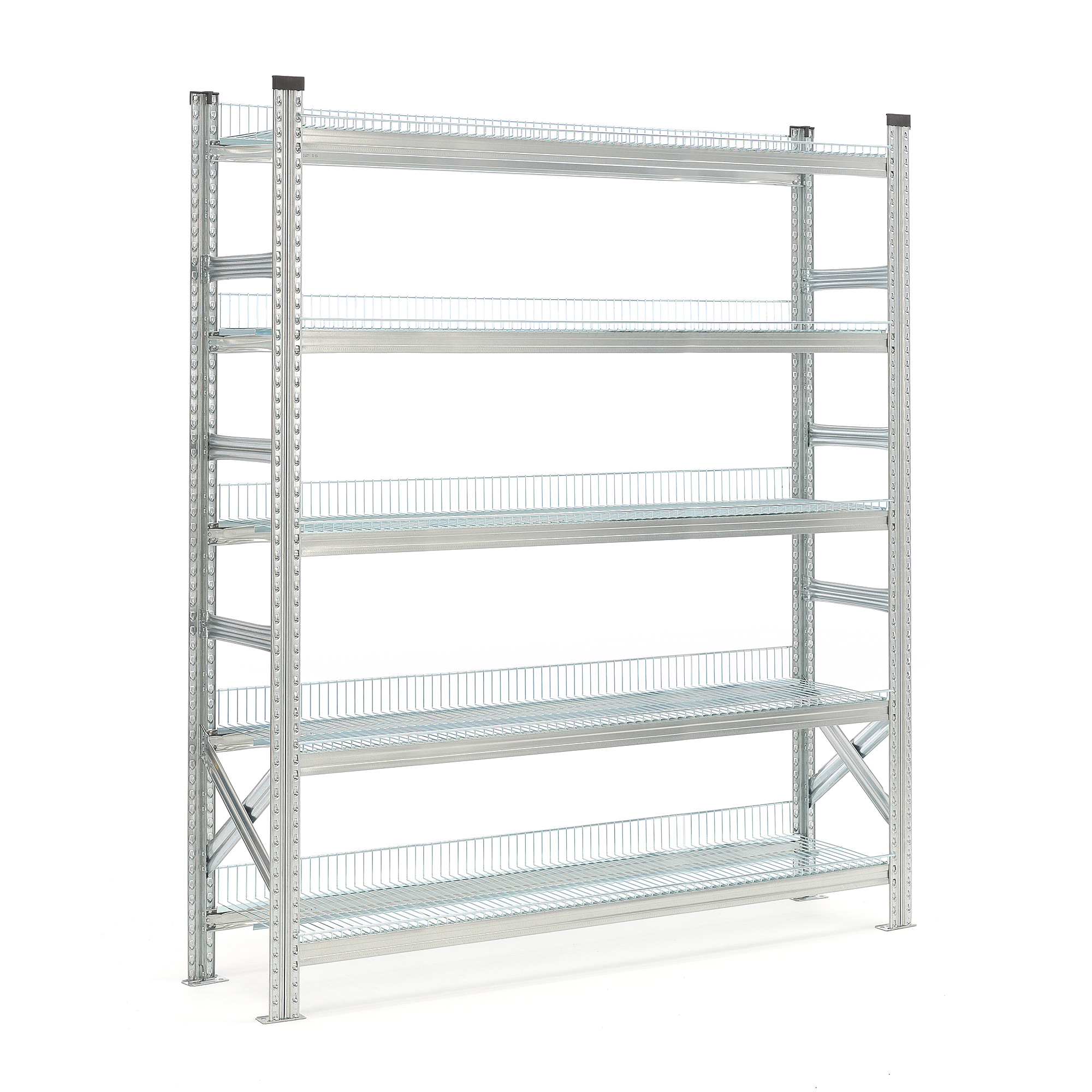 Robust grundsektion, der kombinerer høj belastningskapacitet med lav egenvægt. Med en række forskelligt tilbehør er det nemt at bygge et meget fleksibelt og individuelt tilpasset reolsystem. Det giver dig mulighed for at få en meget pladsbesparende opbevaringsløsning, der er fuldstændigt skræddersyet til virksomheden.Reolsystemet er velegnet til barske, krævende miljøer, såsom lager og værksted. Det er også et rigtig godt alternativ til eksempelvis kontor og butik. Samtlige dele og tilbehør er nemme at samle uden brug af skruer eller bolte. Det gør det let at ændre og ombygge reolsystemet, i takt med at behovet forandrer sig.Grundsektionen leveres med hylder af galvaniseret trådgitter. Trådgitret gør, at hylderne ikke samler støv og snavs. Du kan placere hylderne i valgfri højde og flytte dem efter behov. Langsiderne er forsynede med forhøjede kanter, og du kan vinkle hylderne i tre forskellige positioner. Grundsektionen leveres med to færdigmonterede gavle med stabiliserende gavlstivere.OBS! Total byggebredde er hyldebredde + 75 mm for grundsektionerne og hyldebredde + 10 mm for påbygningssektionerne.